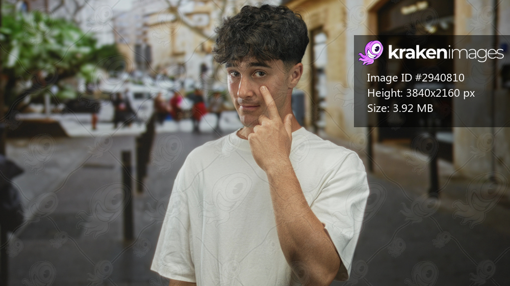 Young hispanic man wearing white t shirt points finger to cheek on busy city street near shops; doubt contemplation.