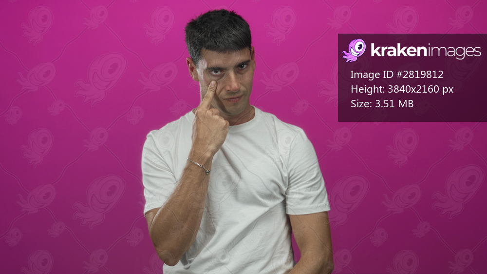 Young hispanic man wearing white t shirt points finger to eye against bright magenta studio wall; focus.