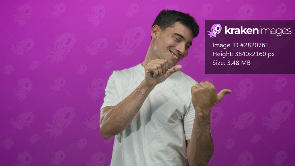 Young hispanic man wearing white tshirt pointing with both thumbs and smiling in purple studio; confidence.