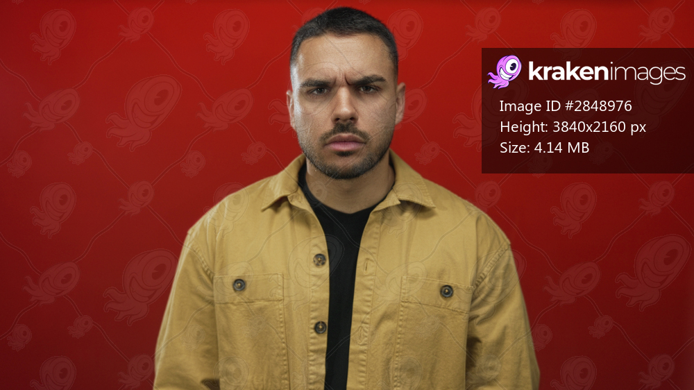Young hispanic man wearing yellow jacket with intense frown in front of red studio wall; frustration.