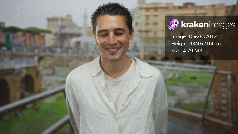 Young hispanic man winking eye among weathered ancient roman ruins at sunrise under clear sky; playfulness.