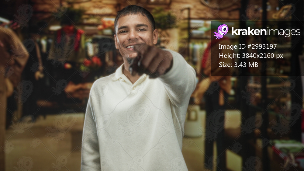 Young hispanic man winking and points finger to camera while smiling, wearing white polo in indoor retail building full of clothing racks; playful confidence. - Kraken Images