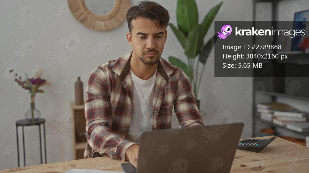 Young hispanic man working at laptop in modern office with plants and decor showcasing focus and concentration; dressed casually with plaid shirt and white t-shirt. - Kraken Images