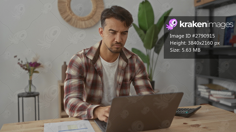 Young hispanic man working on a laptop in a modern office with a calculator, papers, and plants, suggesting a focused and productive work environment.