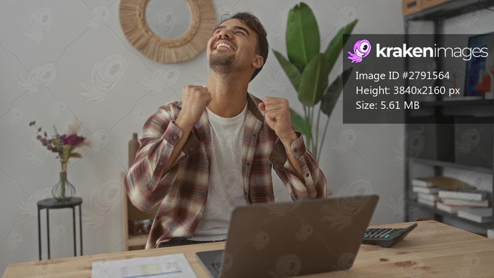 Young hispanic man working on a laptop in a modern office with a calculator, papers, and plants, suggesting a focused and productive work environment.