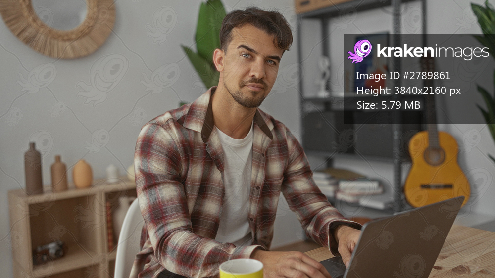 Young hispanic man working on laptop in modern office interior with guitar visible in background showing thoughtful expressions