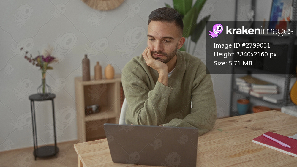 Young hispanic man yawning in a cozy living room setting, appearing tired while sitting at a wooden table with a laptop, surrounded by home decor and colorful notebooks. - Kraken Images