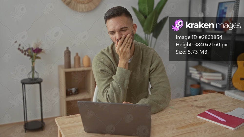 Young hispanic man yawning in a cozy living room setting, appearing tired while sitting at a wooden table with a laptop, surrounded by home decor and colorful notebooks. - Kraken Images