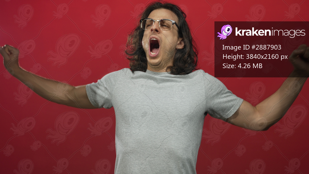 Young hispanic man yawning with open mouth and stretched arms, long hair and glasses, in red studio; sleepy fatigue.