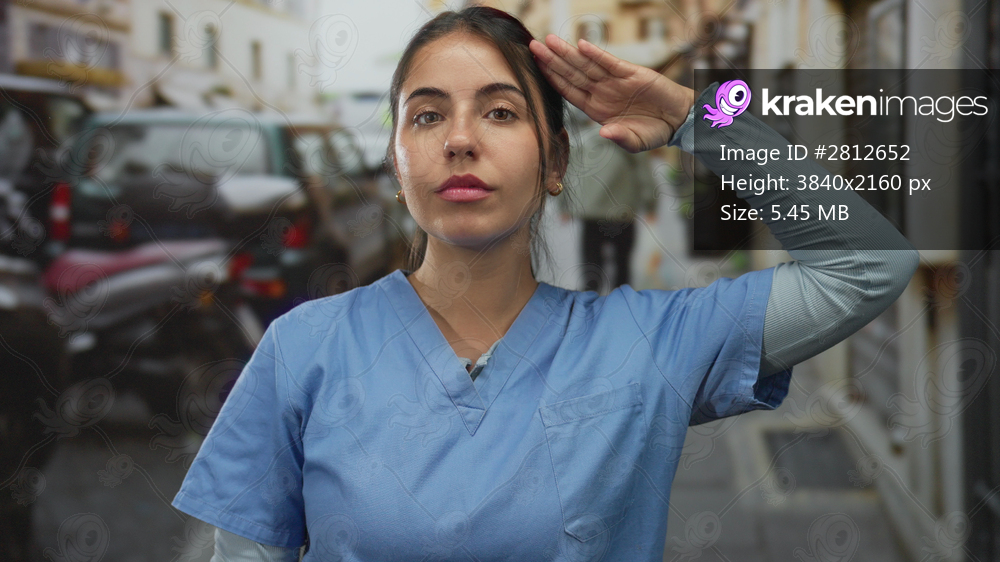 Young hispanic nurse salutes with hand raised on a busy city street at sunrise; patriotism honor duty pride.