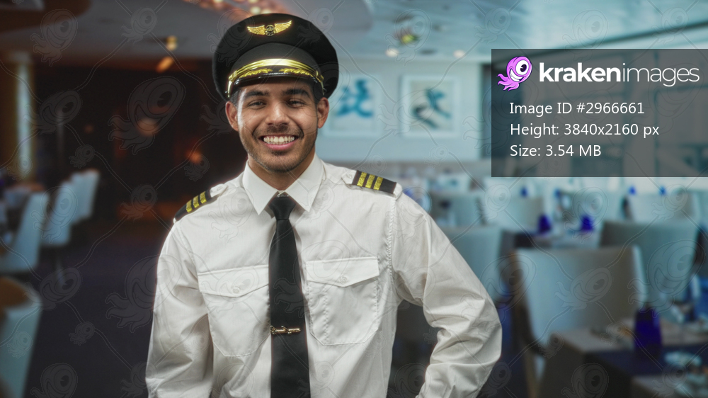 Young hispanic pilot smiles and tilts head, wearing captain hat, uniform shirt, epaulettes and tie in airport lounge; confidence welcome.