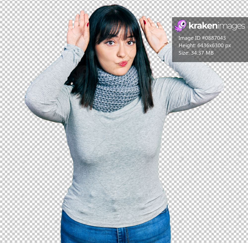 Young hispanic plus size woman wearing winter scarf doing bunny ears gesture with hands palms looking cynical and skeptical. easter rabbit concept.