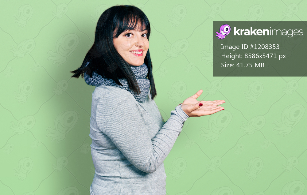 Young hispanic plus size woman wearing winter scarf pointing aside with hands open palms showing copy space, presenting advertisement smiling excited happy