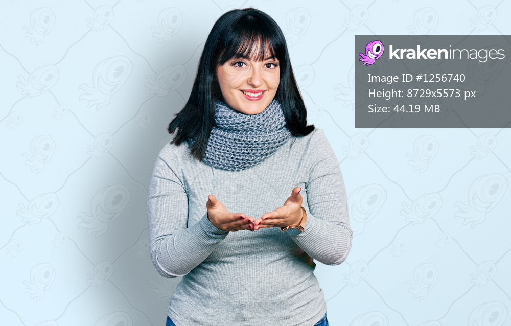 Young hispanic plus size woman wearing winter scarf smiling with hands palms together receiving or giving gesture. hold and protection