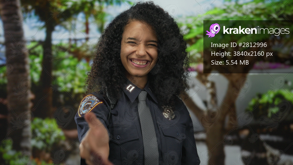 Young hispanic police officer extends hand for handshake with smiling face in forest setting; friendly greeting trust community.