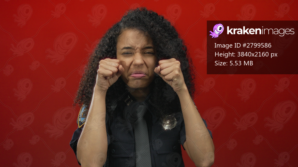 Young hispanic police officer in uniform presses fists under eyes and frowns in a studio; sadness.