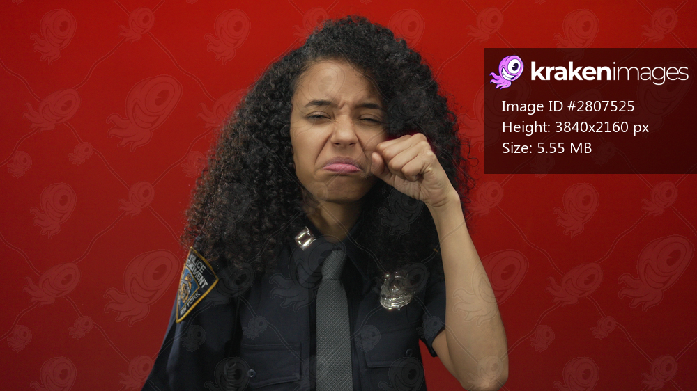 Young hispanic police officer in uniform presses fists under eyes and frowns in a studio; sadness.