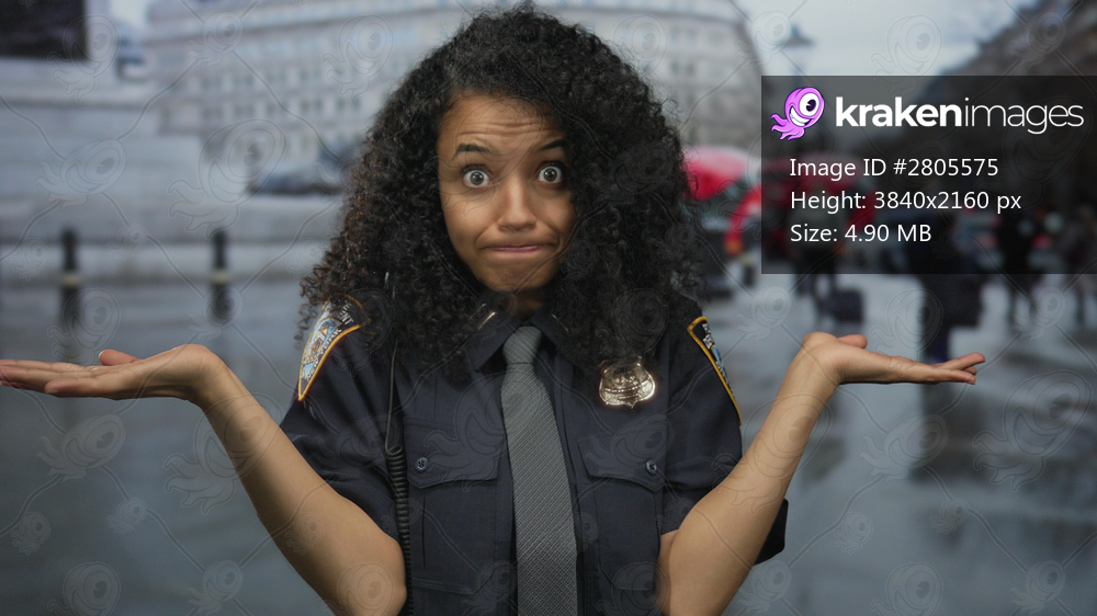 Young hispanic police officer shrugs shoulders in navy uniform on wet urban street amid blurred pedestrians; uncertainty.