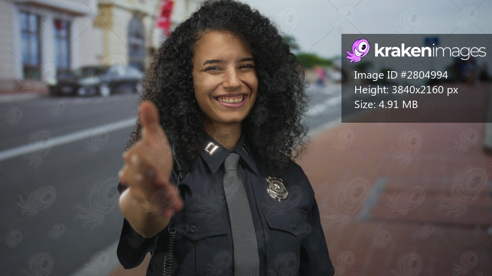 Young hispanic policewoman in uniform extends hand to camera on busy downtown red brick sidewalk by street; trust welcome connection approach.