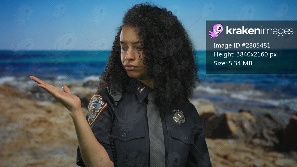 Young hispanic policewoman in uniform standing confidently by the seaside, showcasing authority and professionalism against a serene beach backdrop.