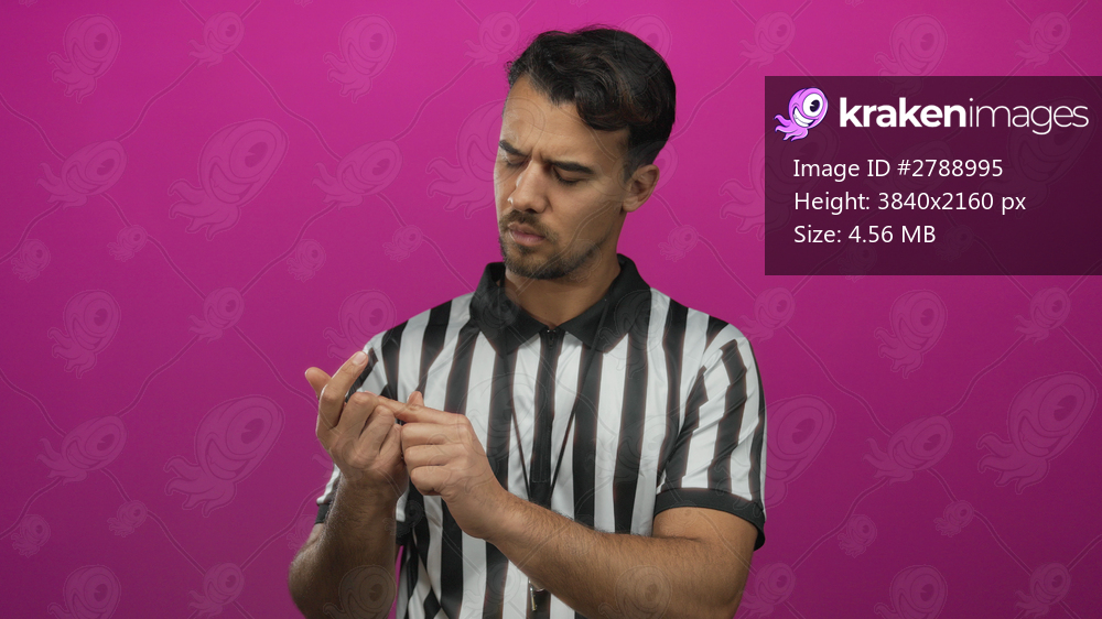Young hispanic referee in striped shirt counting with fingers over pink background, focused and thoughtful expression.