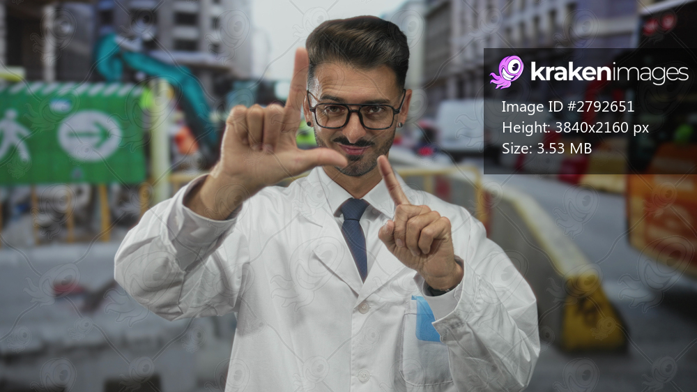 Young hispanic scientist in white lab coat frames scene with fingers on street; innovation vision confidence.