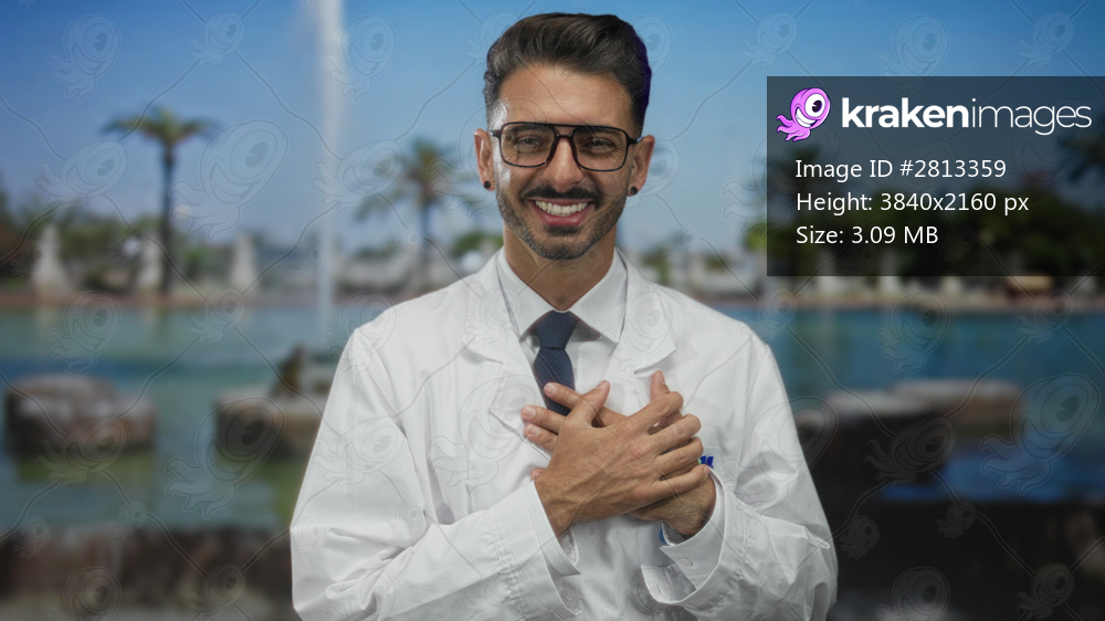 Young hispanic scientist in white lab coat and glasses clutches chest for heartattack on busy street; pain.