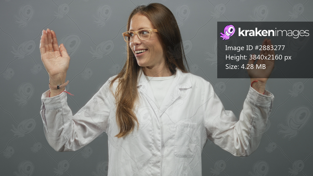 Young hispanic scientist woman in white lab coat with hands raised in a studio against a gray wall; calm confidence.
