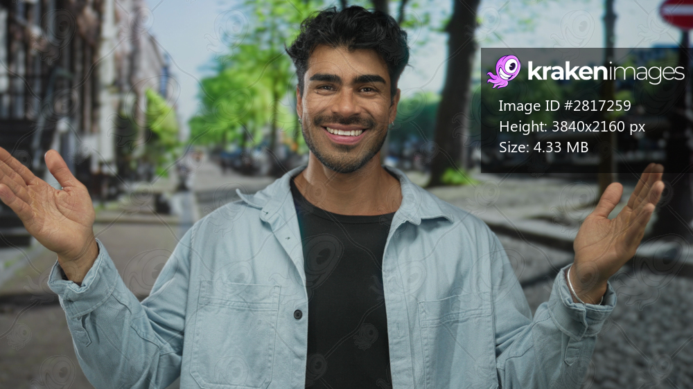Young hispanic smiling man spreads hands wide for large measurement on busy city street; confidence openness.