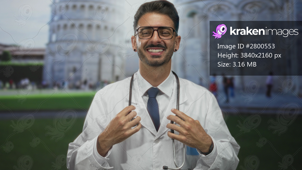 Young hispanic smiling man wearing whitecoat and glasses lifts stethoscope in building; confidence care.