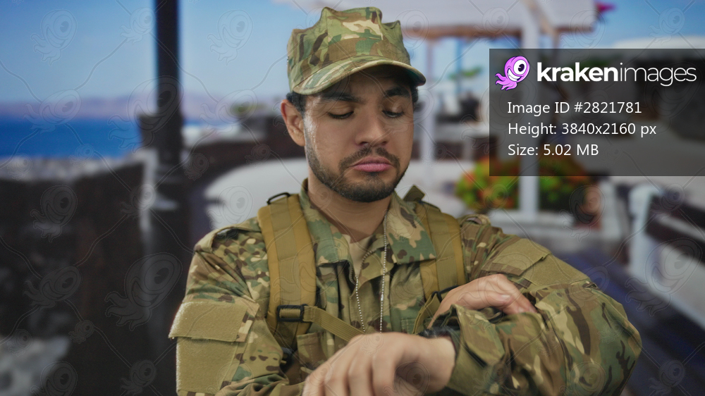 Young hispanic soldier in camouflage uniform checks watch while standing on street and wearing backpack; duty.