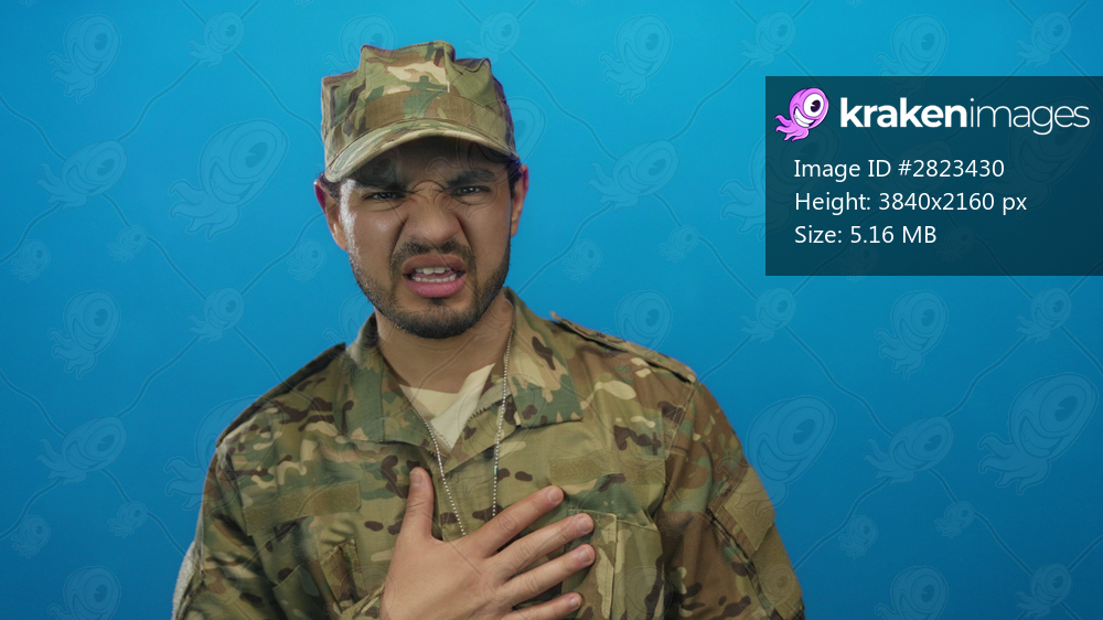 Young hispanic soldier in camouflage uniform clutching chest against bright blue backdrop in studio; pain heartattack.