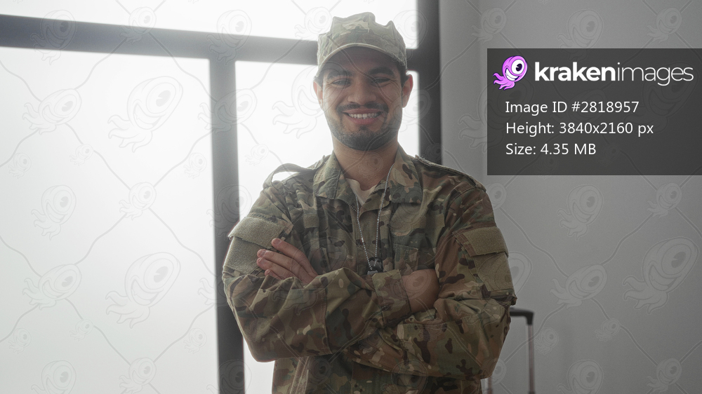 Young hispanic soldier in camouflage uniform and dog tags stands with crossed arms before a large window in a building; strength.