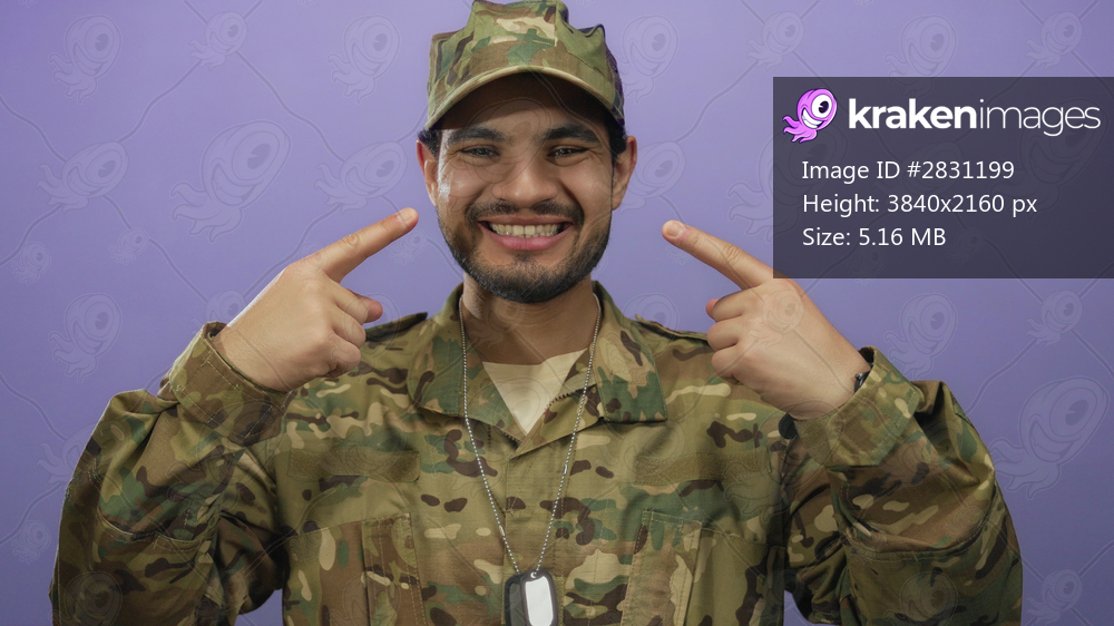 Young hispanic soldier in camouflage uniform points finger to face while wearing dog tags in purple studio; pride duty.