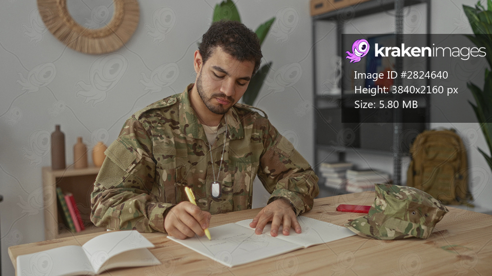 Young hispanic soldier wearing dogtags writing in notebook on wooden table in living room; determination duty.