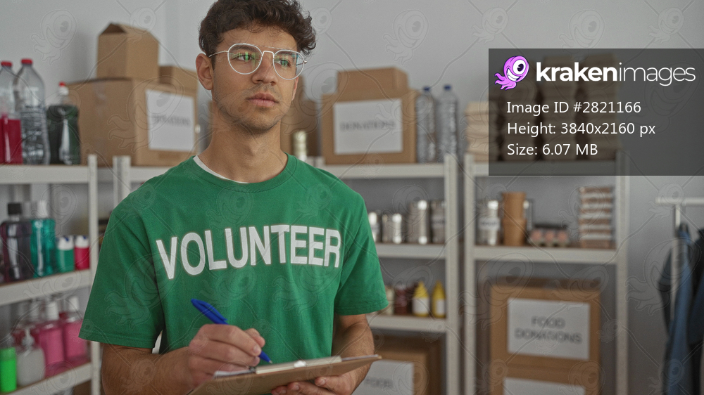 Young hispanic volunteer man wearing green shirt writes notes on clipboard in donation center room; compassion.