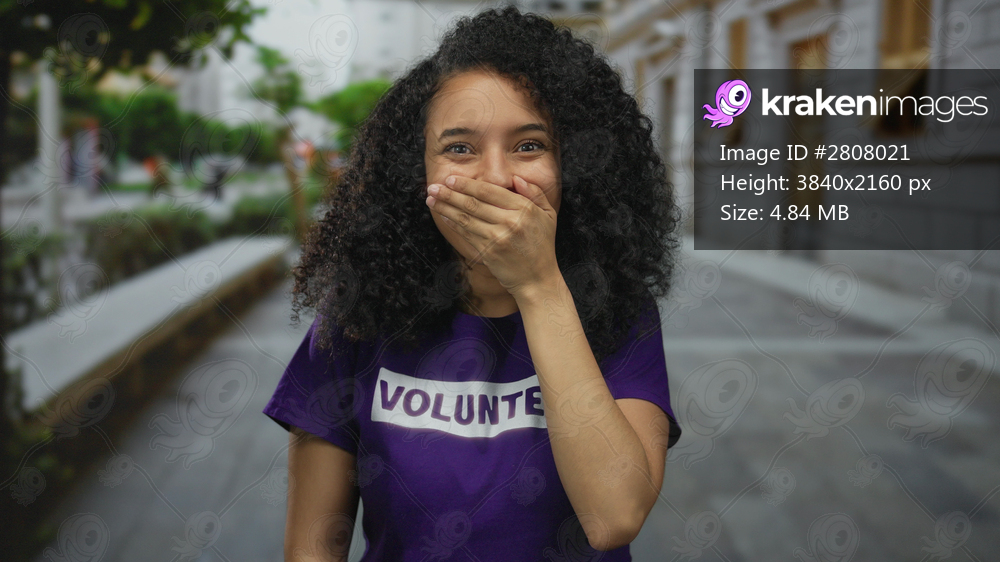 Young hispanic volunteer woman covers her eyes and mouth in a gesture of shock while standing on a city street with buildings and trees; surprise.