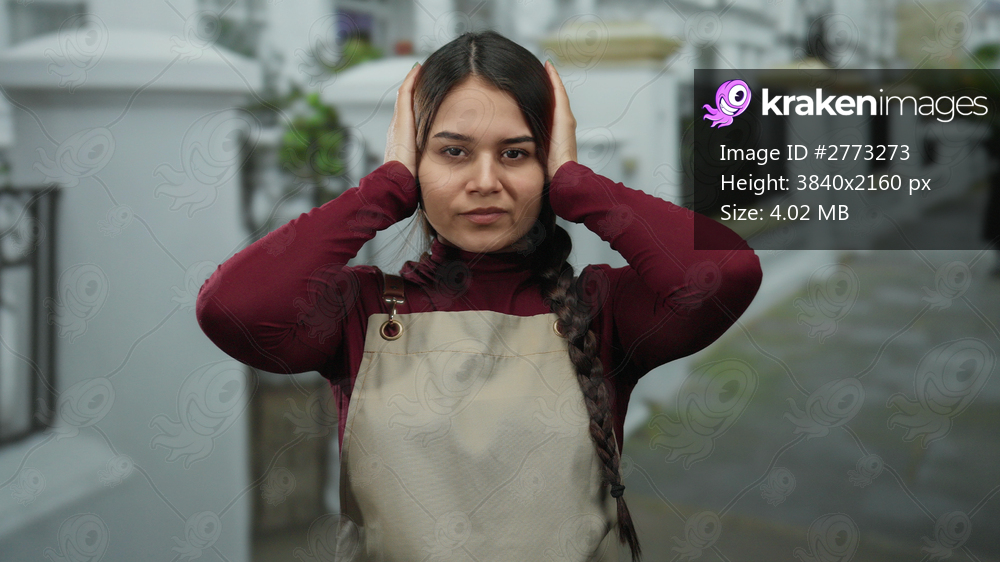 Young hispanic waitress wearing apron stands on an outdoor street covering her ears with her hands, appearing contemplative and serene amidst the urban background. - Kraken Images