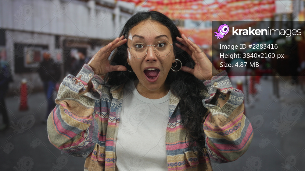 Young hispanic woman adjusting glasses on street with market banners and hands framing her face; surprise curiosity.