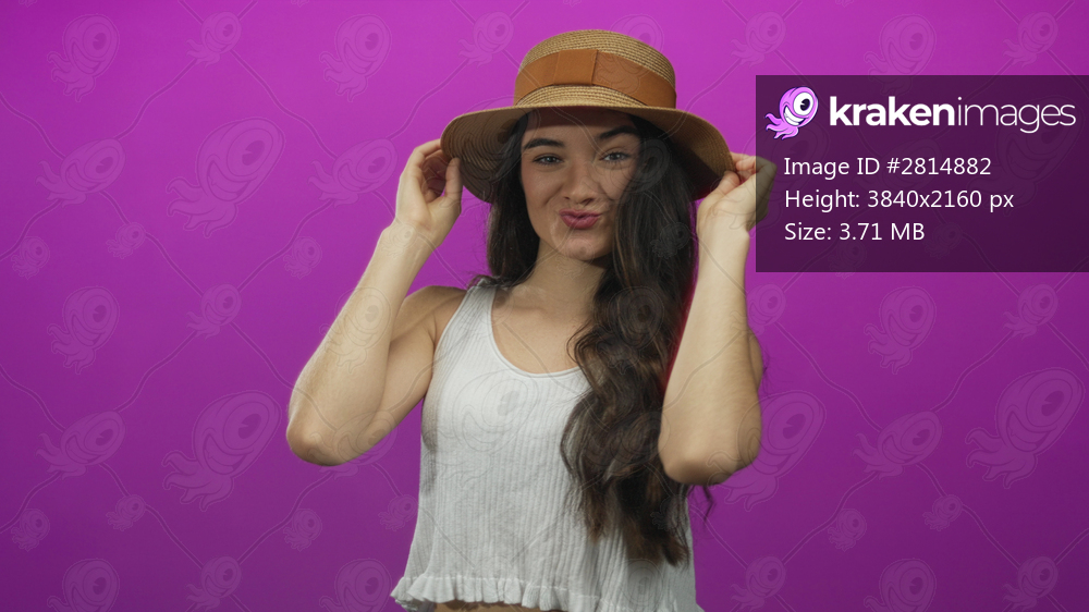 Young hispanic woman adjusting straw hat with closed eyes in purple studio; playful excitement.