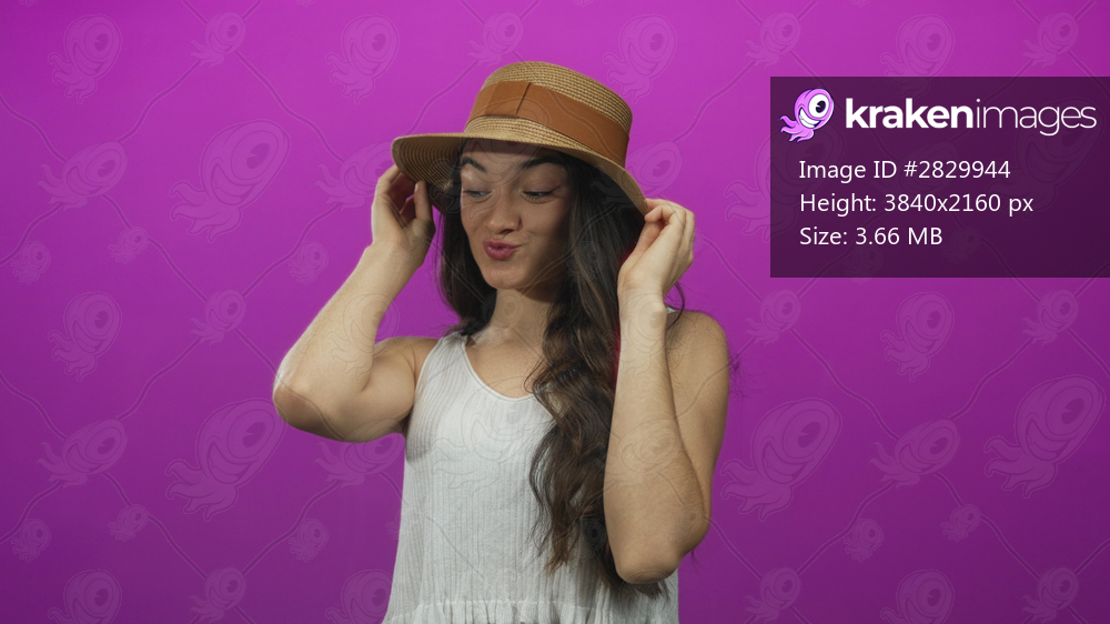 Young hispanic woman adjusting straw hat with closed eyes in purple studio; playful excitement.