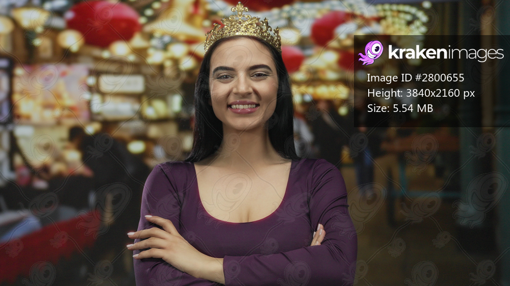 Young hispanic woman adjusts crown on head outdoors with colorful urban backdrop and bright hanging lights conveying royalty and confidence in urban setting - Kraken Images