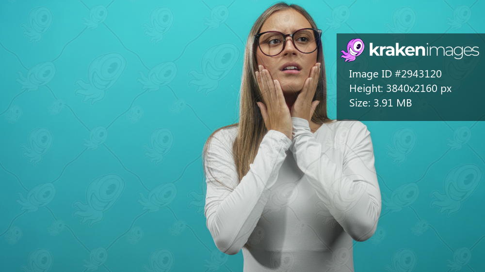 Young hispanic woman adjusts glasses and hair while frowning in studio; confused introspective moment.