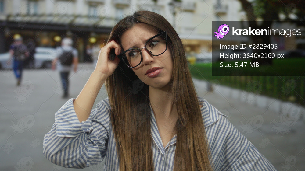 Young hispanic woman adjusts glasses on a bustling sunlit city street amid blurred pedestrians; contemplation.