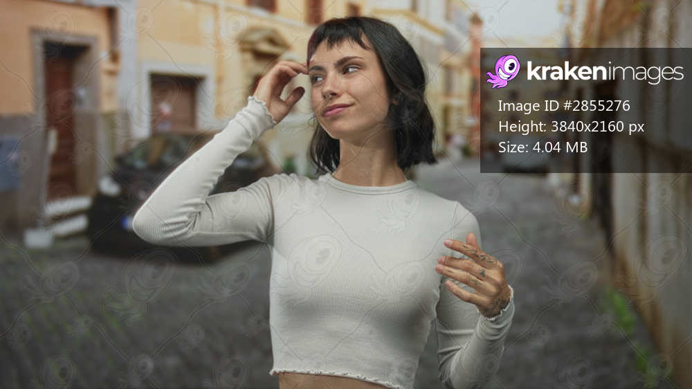 Young hispanic woman adjusts hair on a narrow cobblestone street with casual gesture and slight smile; selfcare confidence.