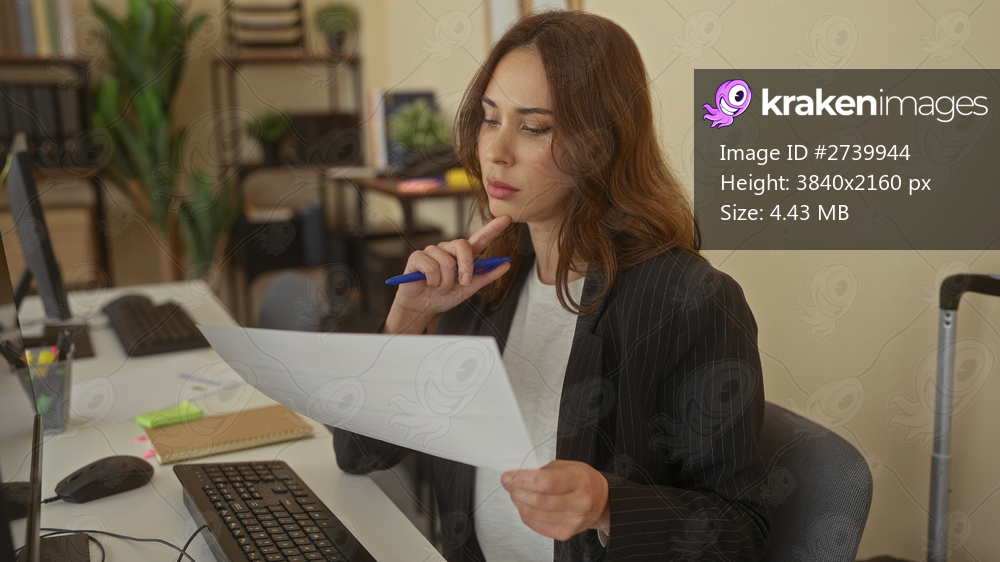 Young hispanic woman analyzing documents in a modern office setting, focusing intently at her desk with a pen in hand, surrounded by computer equipment and office supplies. - Kraken Images