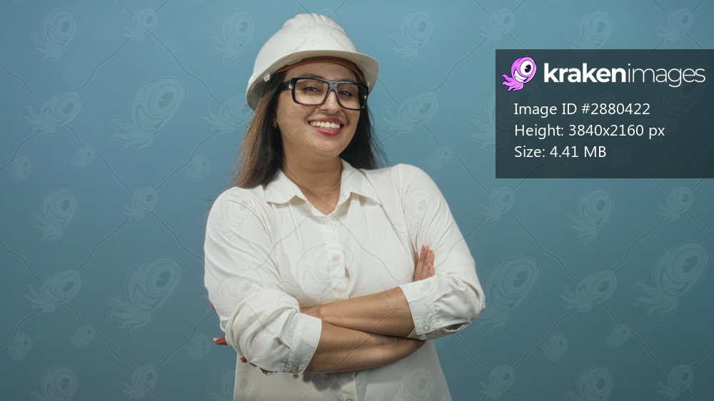 Young hispanic woman architect wearing white hardhat and glasses, smiling with arms crossed in blue studio; confidence empowerment career.
