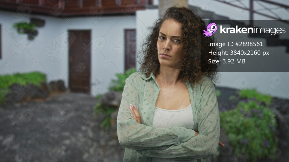 Young hispanic woman with arms crossed at house entrance building, wearing sheer green shirt and white tank top; rejection tension.
