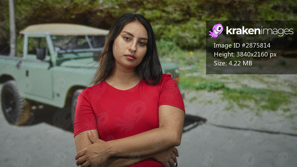 Young hispanic woman with arms crossed by a light green vehicle on a forest road, wearing red shirt and neutral expression; quiet contemplation.