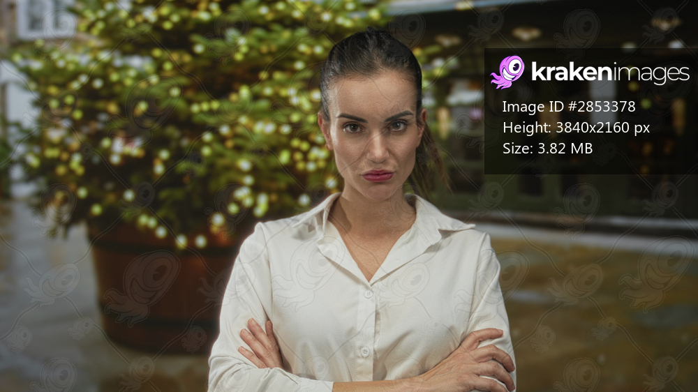 Young hispanic woman arms crossed in front of christmas tree on street; rejection determination defiance.